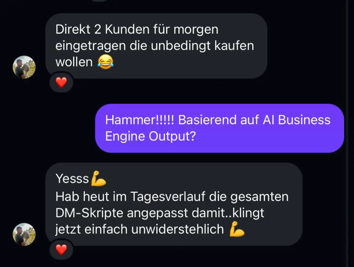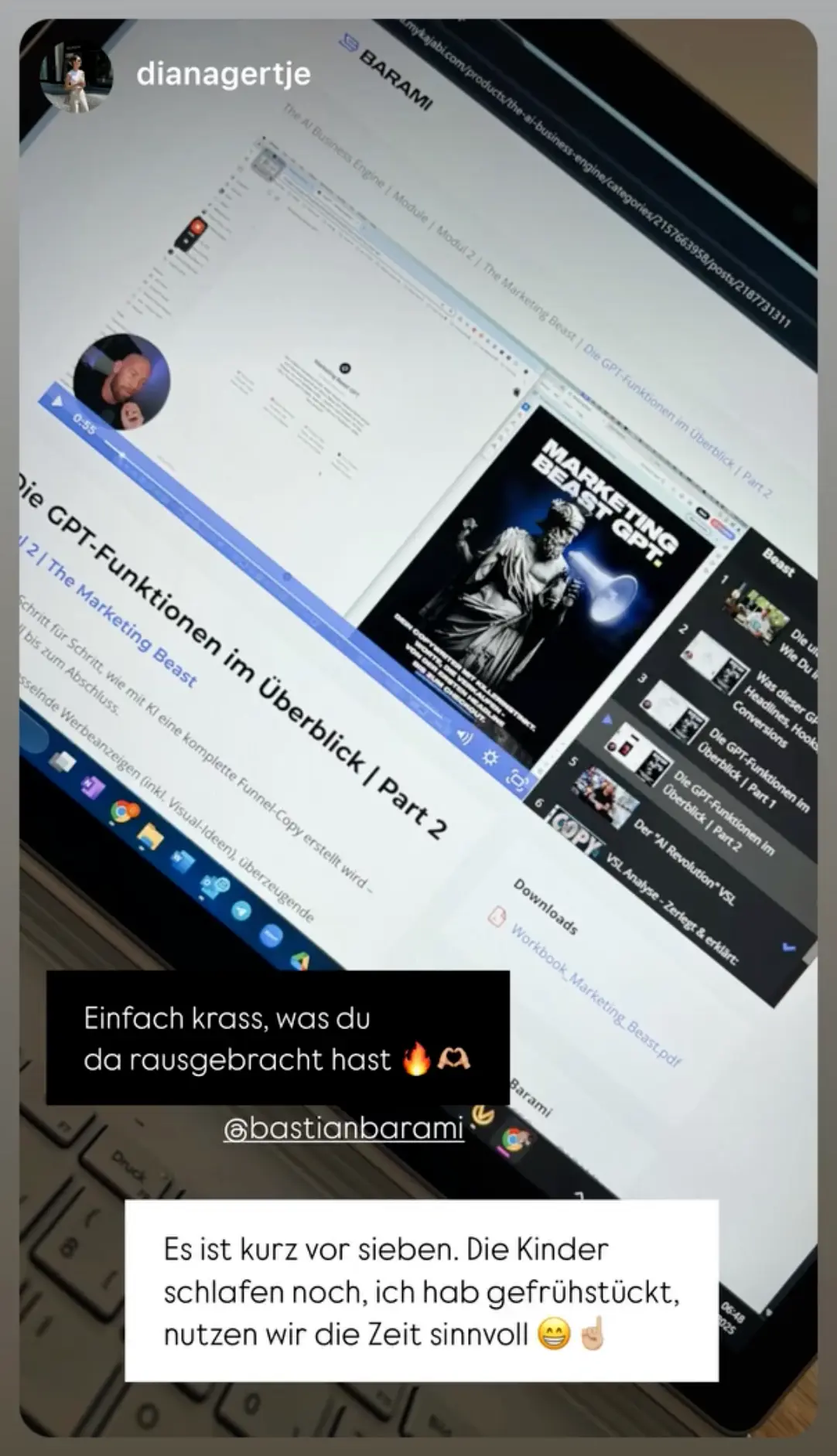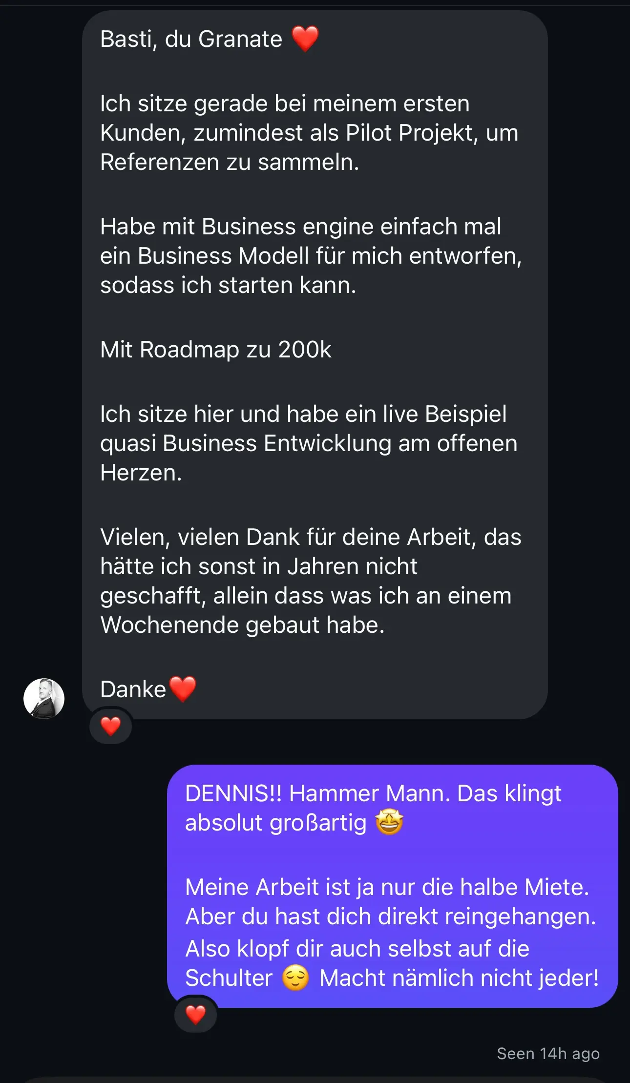 @Bastian Barami ich glaube man gar nicht genug in Worte fassen was Al BUSINESS ENGINE für möglichkeiten bereithält, dadurch dass ich gefühlt mit ADHS-Momenten gesegnet bin, habe ich nun endlich jemanden der mich in den Arsch tritt und genau sagt was Sache ist. Dieser jemand sagt ganz klipp und klar " aus pfui, Hundeplatz, ab ins Körbchen" wenn man wieder zu viel mit einmal machen möchte, ab jetzt heißt es Fokus und den Stein ins Rollen bringen! Btw, habe meine konkreten Schritte für die nächsten 2 Wochen, nur werde ich vorher Marketing Beast aus dem Tiefschlaf erwecken. Liebe geht raus! Beste Grüße Dennis
