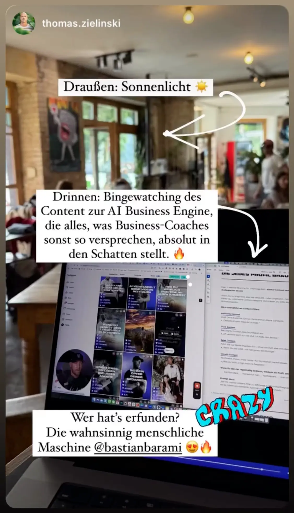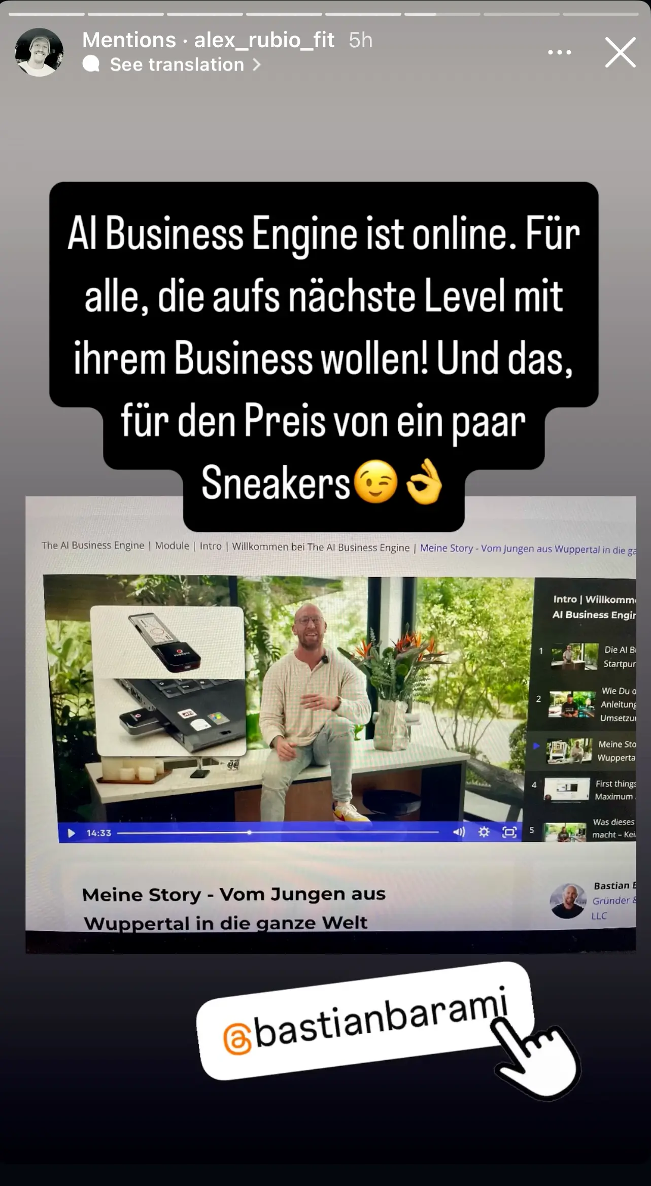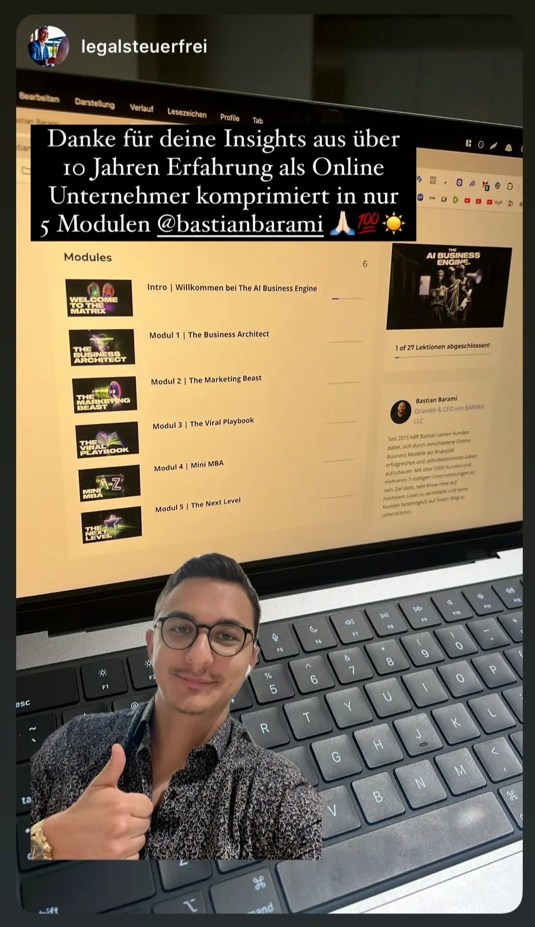 @Bastian Barami ich glaube man gar nicht genug in Worte fassen was Al BUSINESS ENGINE für möglichkeiten bereithält, dadurch dass ich gefühlt mit ADHS-Momenten gesegnet bin, habe ich nun endlich jemanden der mich in den Arsch tritt und genau sagt was Sache ist. Dieser jemand sagt ganz klipp und klar " aus pfui, Hundeplatz, ab ins Körbchen" wenn man wieder zu viel mit einmal machen möchte, ab jetzt heißt es Fokus und den Stein ins Rollen bringen! Btw, habe meine konkreten Schritte für die nächsten 2 Wochen, nur werde ich vorher Marketing Beast aus dem Tiefschlaf erwecken. Liebe geht raus! Beste Grüße Dennis