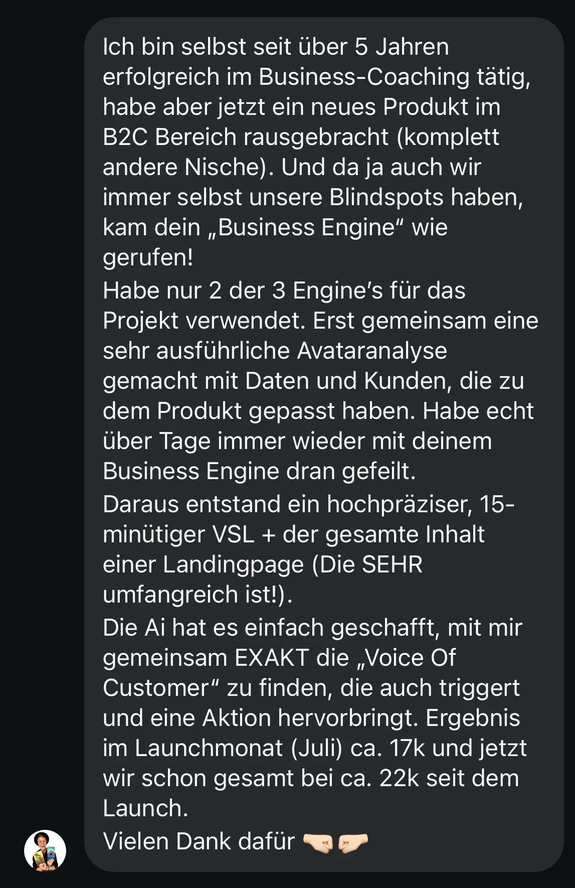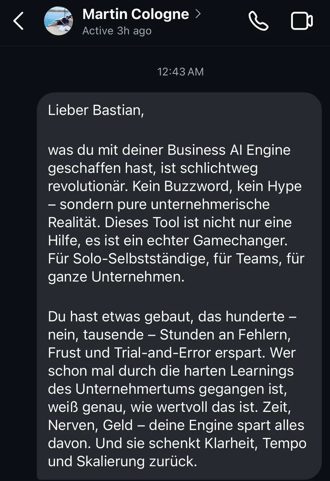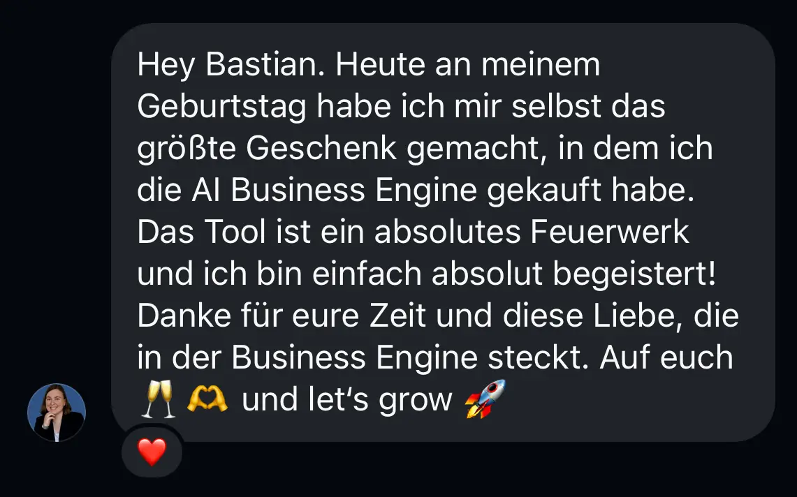 Lieber Bastian! Ich bin dir und deinem Team zutiefst dankbar für dieses unglaublich starke Programm! Dein Al Business Engine übertrifft meine Erwartungen um Längen, schafft Klarheit und Struktur zuerst in meinem Kopf! Jetzt traue ich mir „Mein Big Business" tatsächlich zu. Vielen herzlichen Dank!!! 🙏