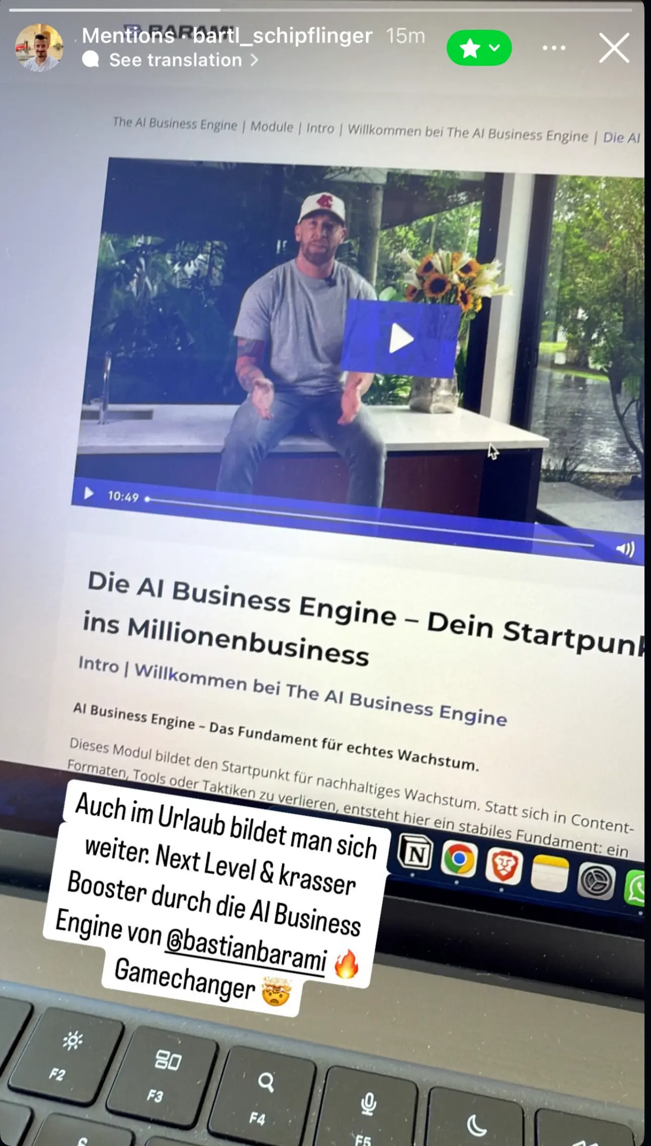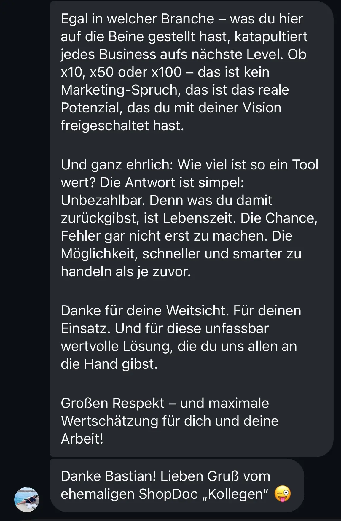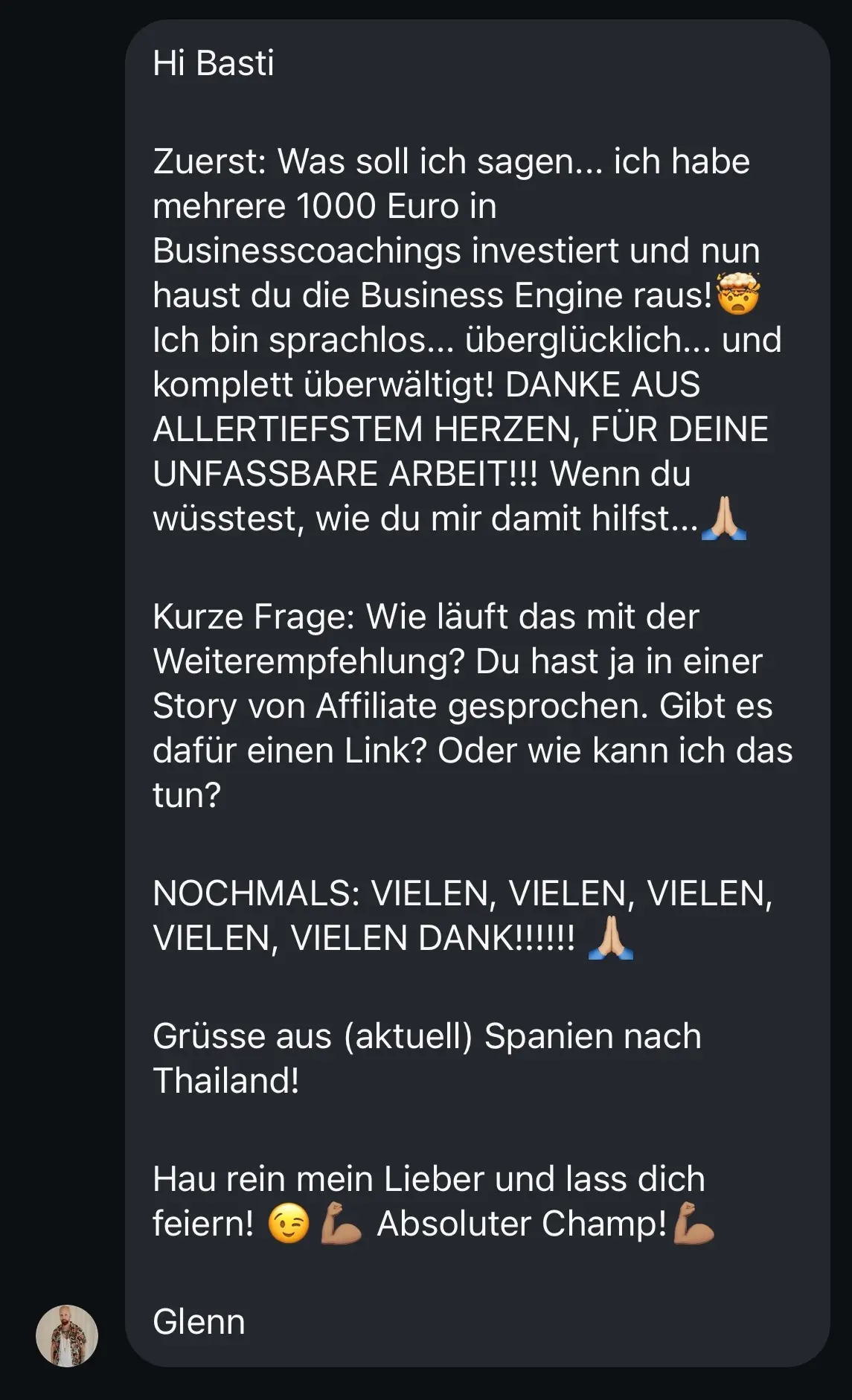 Lieber Bastian! Ich bin dir und deinem Team zutiefst dankbar für dieses unglaublich starke Programm! Dein Al Business Engine übertrifft meine Erwartungen um Längen, schafft Klarheit und Struktur zuerst in meinem Kopf! Jetzt traue ich mir „Mein Big Business" tatsächlich zu. Vielen herzlichen Dank!!! 🙏