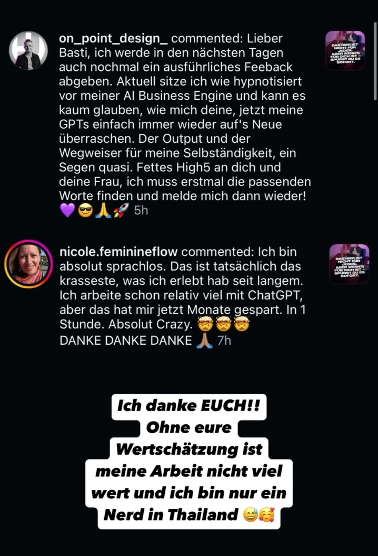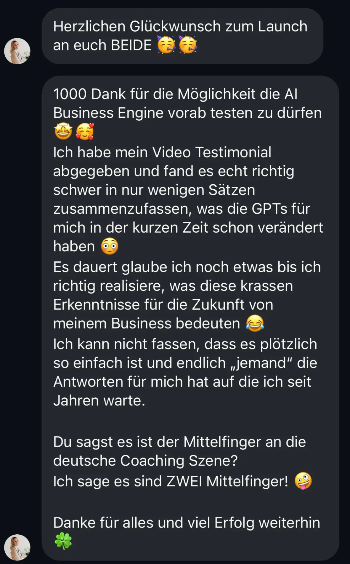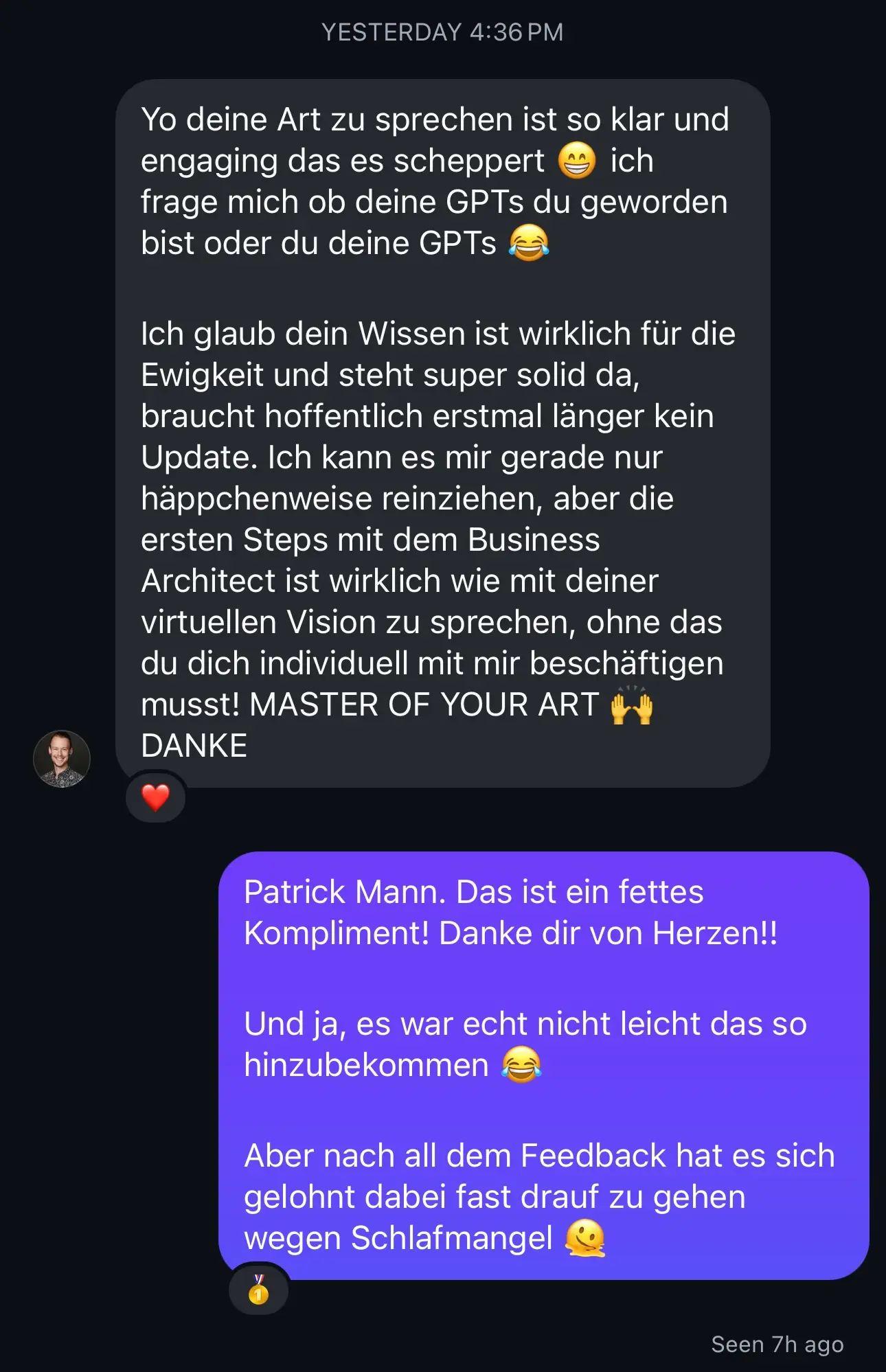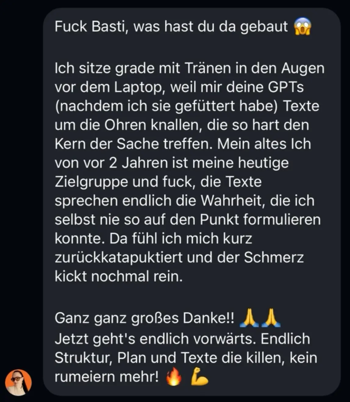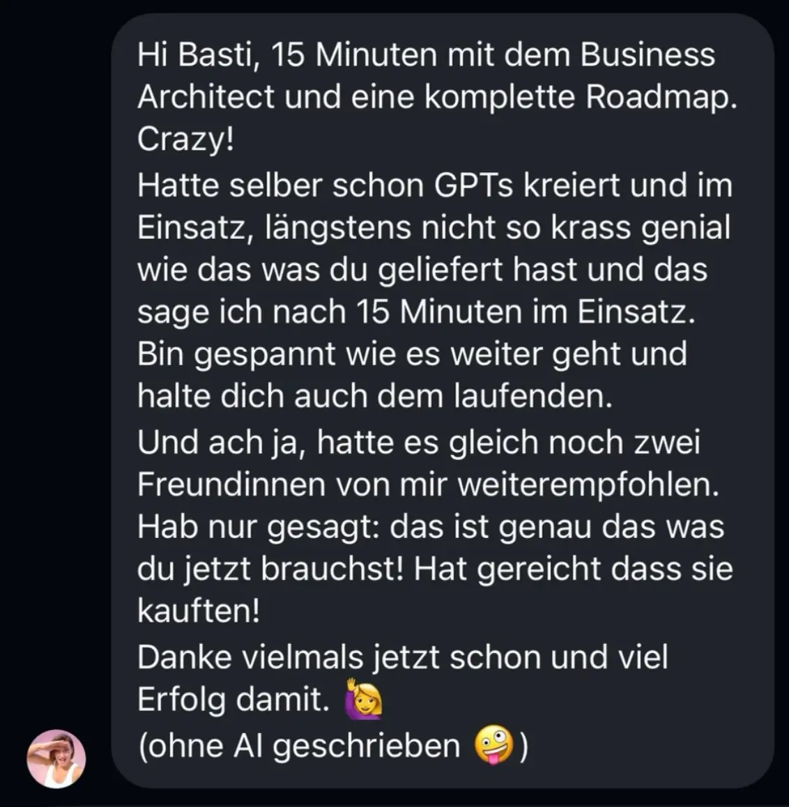 Ich bin überwältigt! Ich finde, Du triffst den Nagel einfach auf den Punkt. Ohne Schnickschnack, ohne Zeitverlust. Einfach messerscharf. Das ist genau das, was ich brauche bzw. eigentlich schon viel früher gebraucht hätte! Ich feiere Dich dafür :-) Ich bin noch nicht durch, arbeite aber bereits intensiv mit dem Business GPT, der einfach Gold wert ist! Danke!!! Zum Vergleich: Ich war letztens in einem Webinar, in dem einige KI-Tools vorgestellt wurden - die Leute haben sich so sehr selbst für das gefeiert, was sie bereits in ihrem Leben erreicht haben und wollten quasi Manychat und HeyGen als die Non-Plus-Ultra-Features verkaufen, die Dir Dein Leben optimieren.