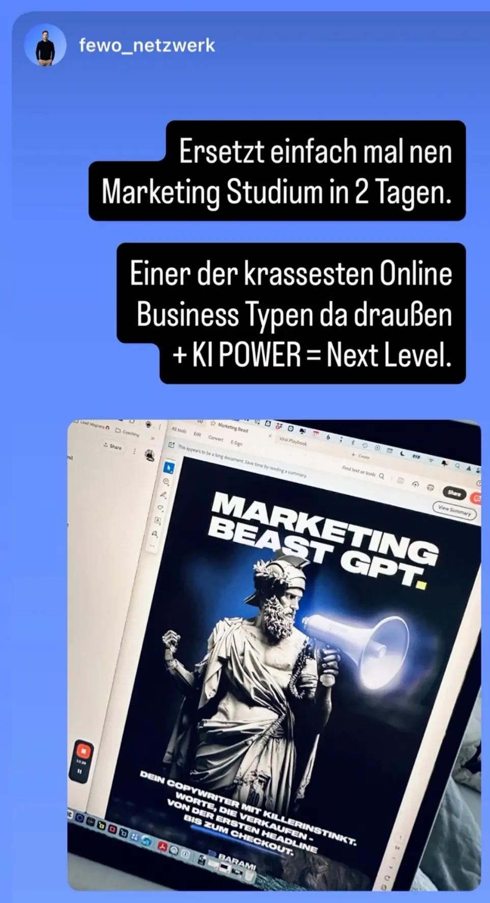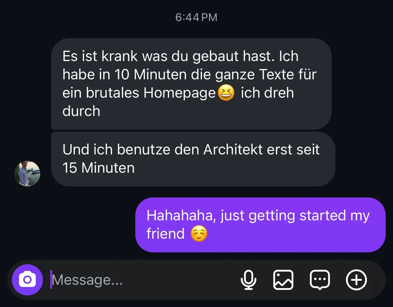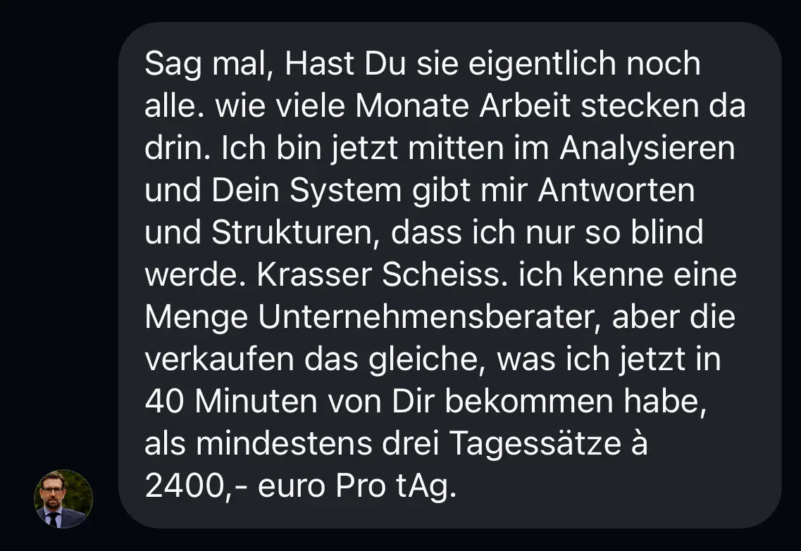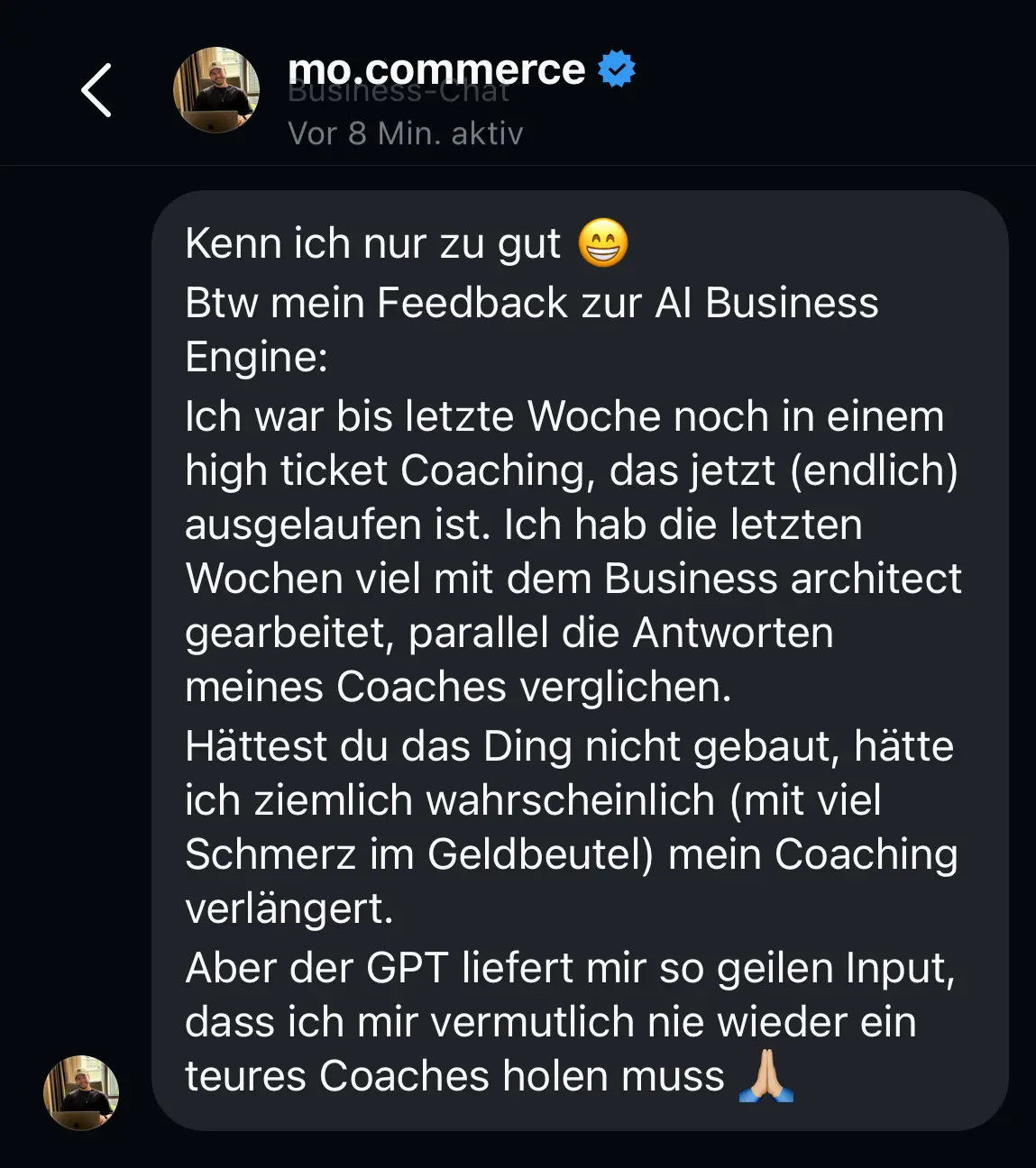 Ich bin einfach nur Baff was du da auf die Beine gestellt hast. 🤯 Einfach nur krank. Genau so was hätte ich schon vor einem halben Jahr gebraucht, dann hätte ich mir die tausenden Euros in Coachings sparen können. 😬 Sei es Varianten des Outreachs, Business Aufbau, Plattformen, Zielgruppe, Validierung, etc. Alles baut nacheinander auf. Einfach so ein geiles System, wo ich jetzt die Tage, auch im Urlaub, tief reingegangen bin und nicht mehr aufhören konnte. Direkt Umsetzungsideen erhalten und genau auf den Punkt gebracht. Alleine dieses Wissen ist unbeschreiblich. Und es fällt einem so leicht von der Hand. Die Coaching Szene muss sich warm anziehe, da du hier wirklich alles abdeckst. Meistens ist es ein bestimmter Bereich wie Inbound Leads via Linkedin, Cold Calling, Businessstruktur, Cold Outreach etc. wo man für jeden Bereich 6 Monate gecoacht wird mit Videokurs, Livecalls, und das für 5-8k. Ist immer das selbe Spiel und man ist damit limitiert und mal ehrlich, so wirkliche Erfolge feiern die meisten nicht mit solchen Coachings. Nur Abzocke. Aber durch diese 3 GPT's wird einem diese Limitierung aufgehoben und es kann nur noch Steil nach oben gehen. 🚀🚀🚀