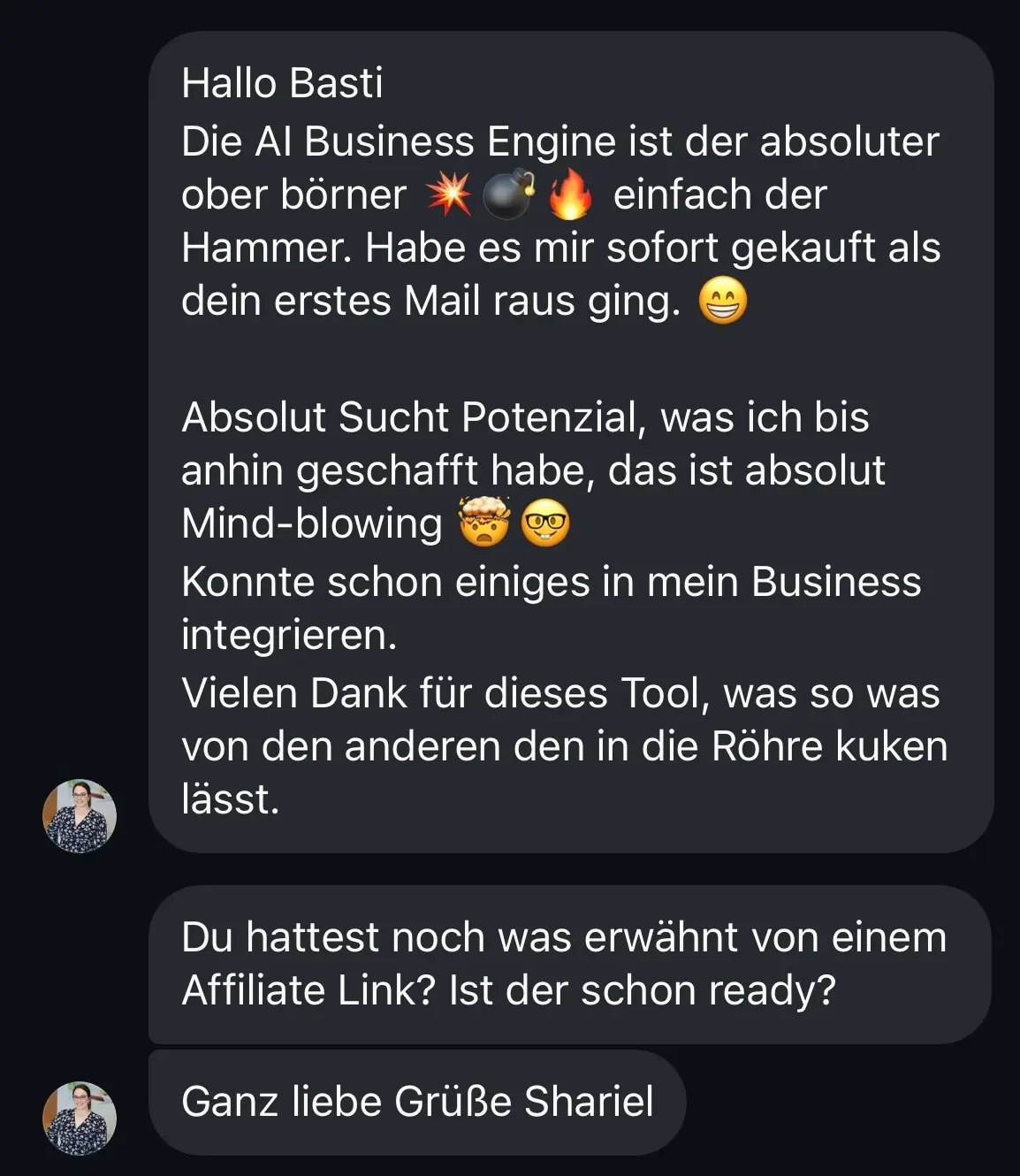 Hi Bastian, also seit ich Zugang zur Al Business Engine habe bin ich wie gefesselt, könnte Tag und Nacht damit verbringen 💥. Ich finde es maximal spannend, da ich aktuell in einem Mentoring bin zum Business Aufbau und was du gebaut hast sprengt einfach alles. Vor allem habe ich meine Positionierung nochmal maximal geschärft mit deinem BusinessArchitekt GPT und meine Landing Page Ruck zuck mit deinem Marketing Beast überarbeitet und das ist erst der Anfang. Danke für diese Chance 🤯 wer sich dieses Tool nicht holt ist selber schuld! Liebe Grüße Natascha