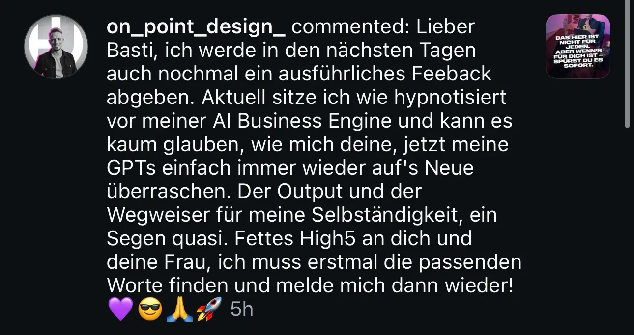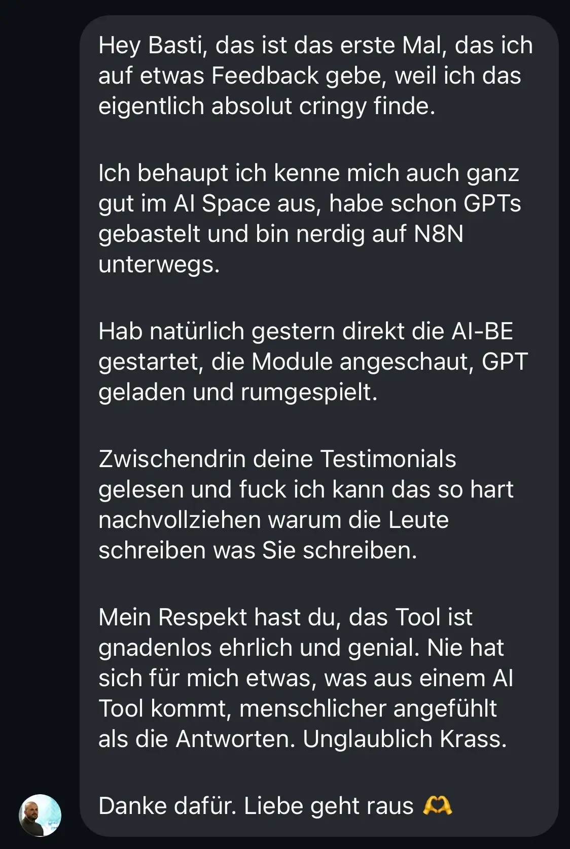 Hey @Bastian Barami die Al Engine hat mir komplett den Stecker gezogen - geisteskrank! Diese 3 GPTs sind nicht einfach Tools, es sind Business-Waffen. Klarheit, Struktur, Umsetzung - auf Knopfdruck. Keine Zeitverschwendung. Keine Floskeln. Nur direkte, umsetzbare Antworten, die wirklich weiterbringen. Ich hasse mittlerweile die zahlreichen Coachings und Videokurse, die für die breite Masse konzipiert werden. Das hilft niemanden. Naja vielleicht dem Verkäufer ;-) Aber diese GPTs sind individuell und geben konkrete Antworten, stellen die Weichen für weitere Schritte. Ich liebe den Architect. Diese strukturierte Vorgehensweise - einfach stark. Man weiß sonst nie wo man anfangen soll - ob Content, ein Angebot, Calls, Linkedln usw.? Aber hier ist man bestens aufgehoben. Vor allem mit den PDF-Anleitungen dazu. Vorallem bin ich in den Output schockverliebt. Die Positionierung, die Hooks etc. Ich muss sie nur noch Copy&pasten so geil sind. Respekt wiedermal für die Qualität, die du lieferst. Auf dich ist Verlass! Ich hab mich so gefreut einer der ersten 50 Leute zu sein. Nicht um 150€ zu sparen, sondern um einer der Ersten zu sein, die es testen dürfen!