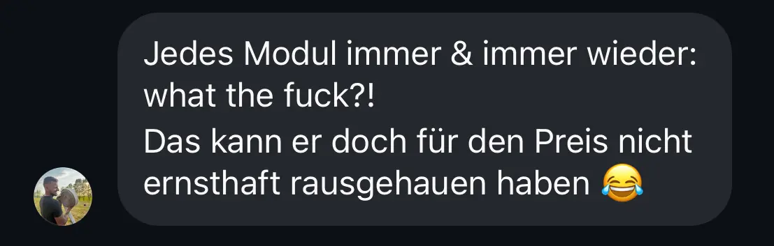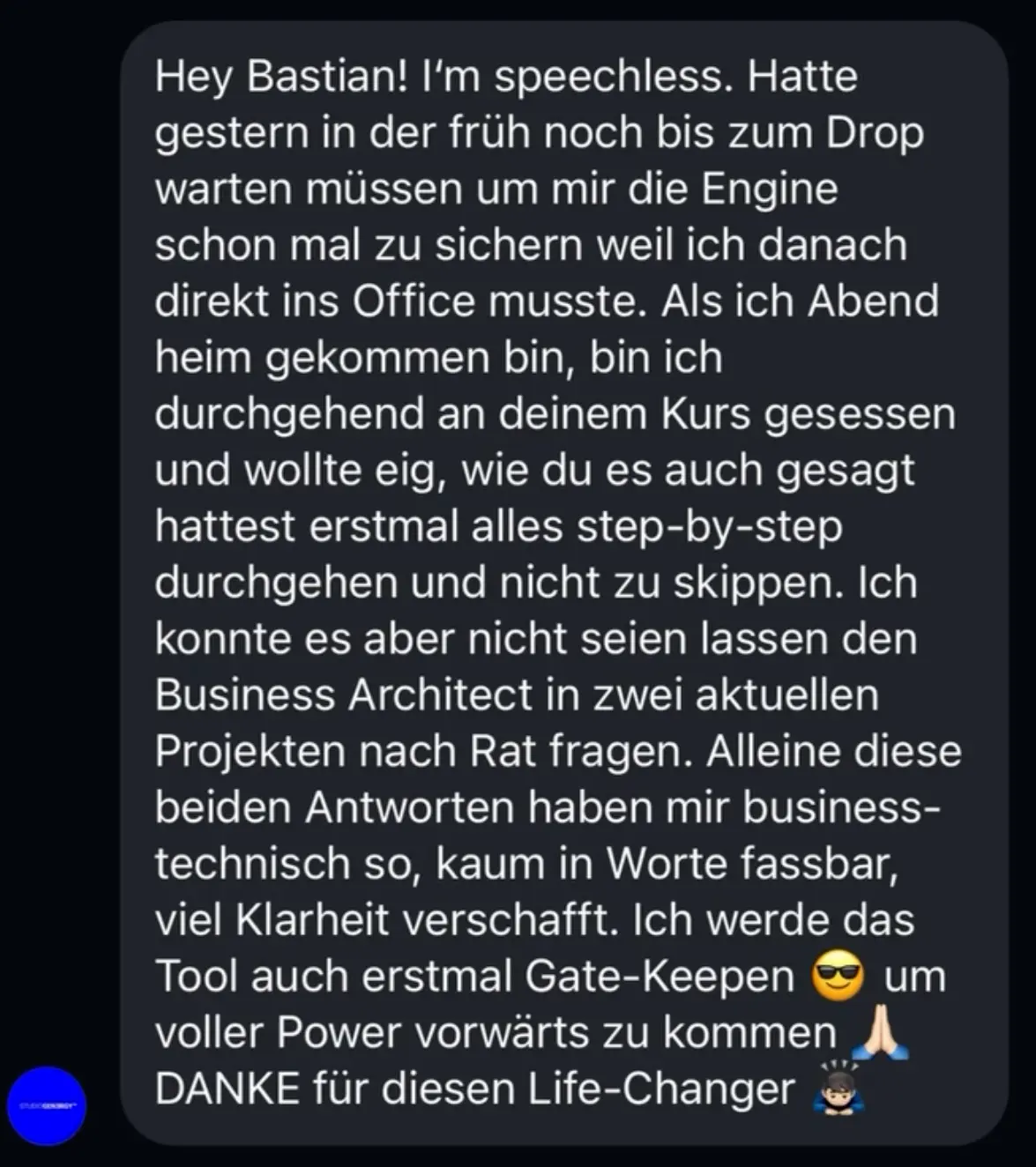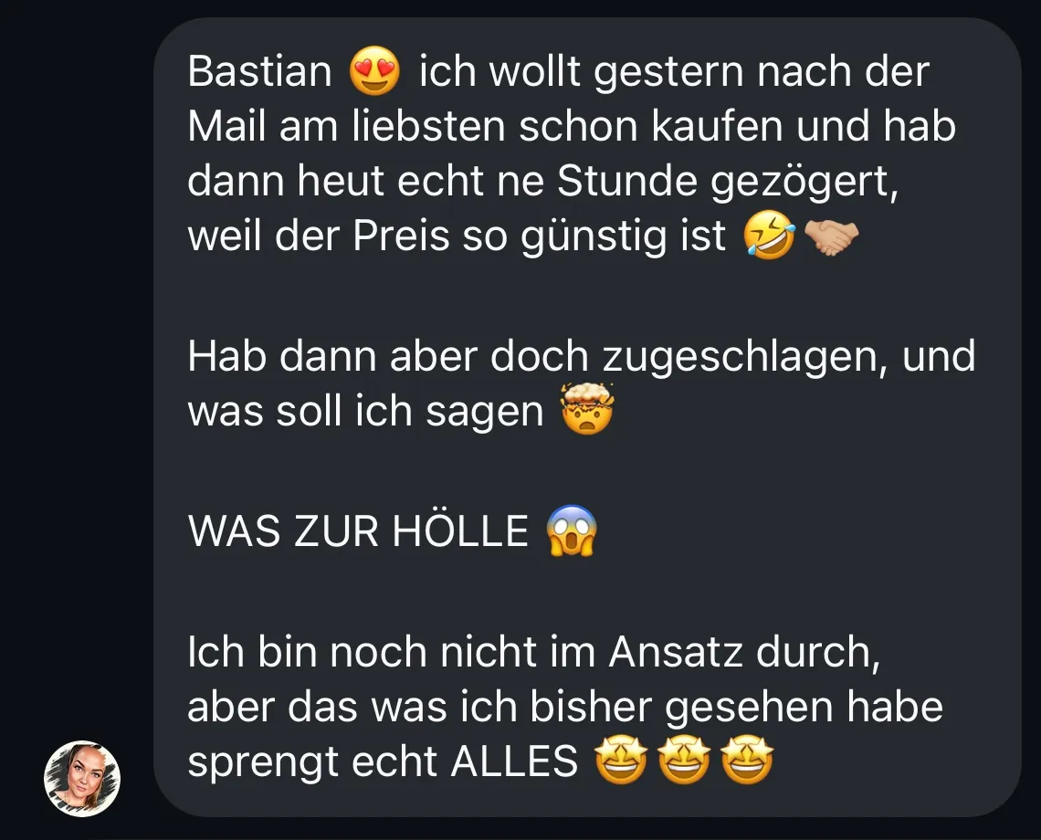 Hey Bastian, ich sag dir ganz ehrlich - ich weiß gar nicht, wie ich das in Worte packen soll. Ich hab jetzt das erste Modul komplett durch und bin gerade ins zweite gestartet, hab mich da schon ein bisschen durchgetestet - und ganz ehrlich: Das ist für mich gerade die genialste Erfindung von 2025! Einfach ein unfassbar starkes Tool. Vielen, vielen Dank schon mal für die ganze Arbeit, den Aufwand und die ganzen Gedanken, die du da reingesteckt hast - man spürt das in jedem Schritt. Ich hab jetzt schon das Gefühl, ich könnte selbst Business Coach für andere werden - so viel Klarheit gibt mir das gerade. Und ich bin echt mega gespannt, wie sich das jetzt auf mein Coaching-Business auswirken wird. Das fühlt sich richtig gut an!