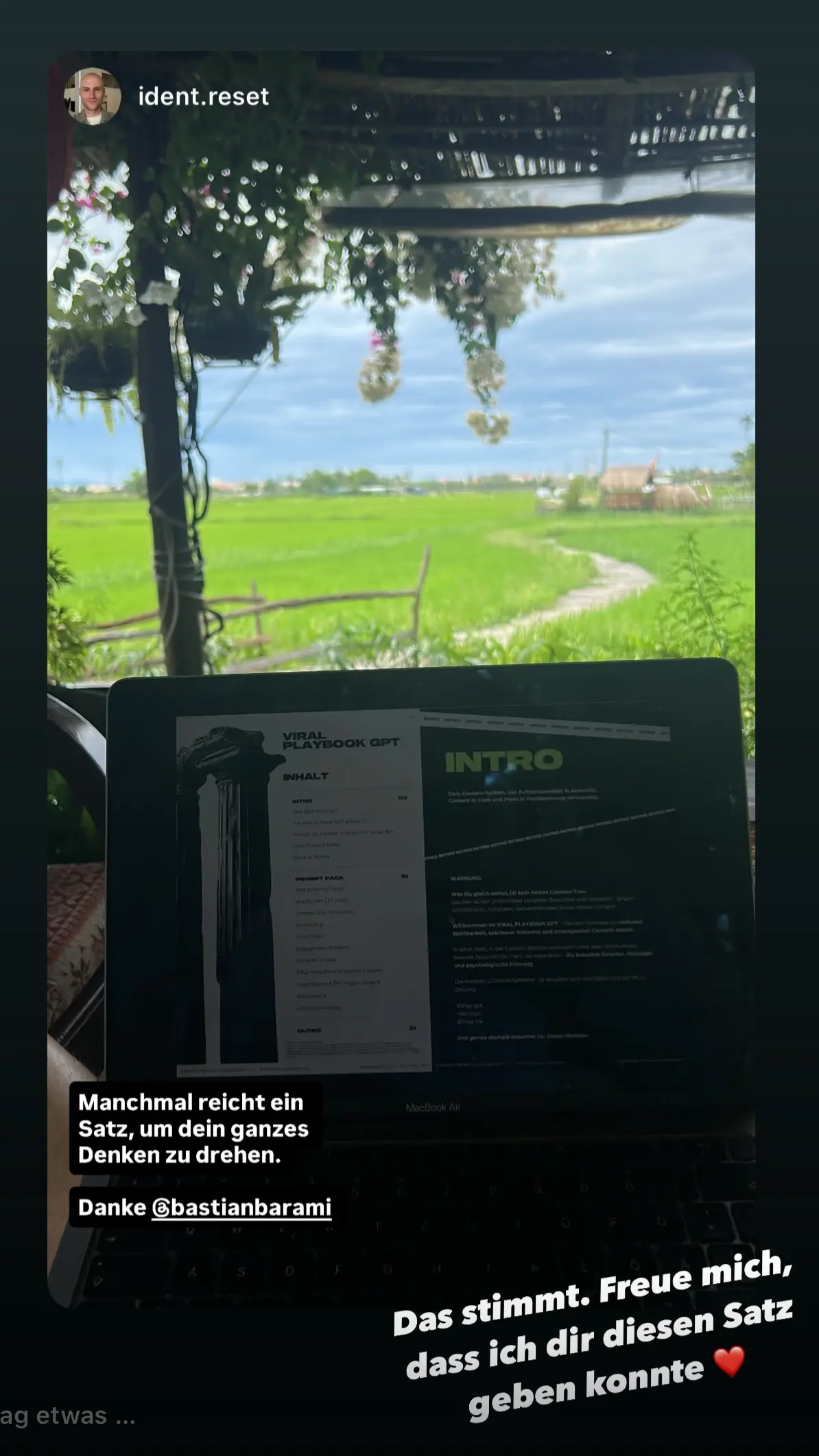 Hi @Bastian Barami, ich bin jetzt bei Modul 5 angekommen und hab gleichzeitig alle drei ChatGPTs im Einsatz - und ganz ehrlich: Mega. Danke für deinen Drive, dein Wissen, dein kompromissloses Umsetzen - und vor allem dafür, dass du's einfach teilst. Diese drei Sparringspartner? Absolute Wucht. Ich geb sie nicht mehr her. I love them 💖 Da, wo's vorher geklemmt hat, geht's jetzt weiter. Der Flow kommt zurück, der Spaß ist wieder da - und jetzt darf's durch die Decke gehen. Ich bin sowas von bereit für gnadenlose Umsetzung und halt mich ab jetzt radikal an alles, was die drei ausspucken. Danke auch für die Möglichkeit, das Ganze kostenlos zu testen - Testimonial kommt auf jeden Fall. Und: Ich hab's trotzdem über deinen Link gekauft - einfach, weil's mir wichtig war, dir was zurückzugeben. Let's go - das wird groß. Michaela